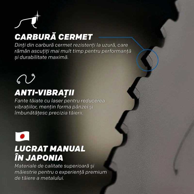 Dispune de 80 de dinti din carbura cermet, mai duri si mai rezistenti la uzura decat varfurile standard din carbura, asigurand taieri mai curate, mai precise si o durata de viata mai lunga a panzei.