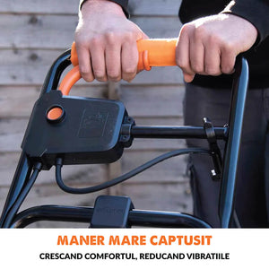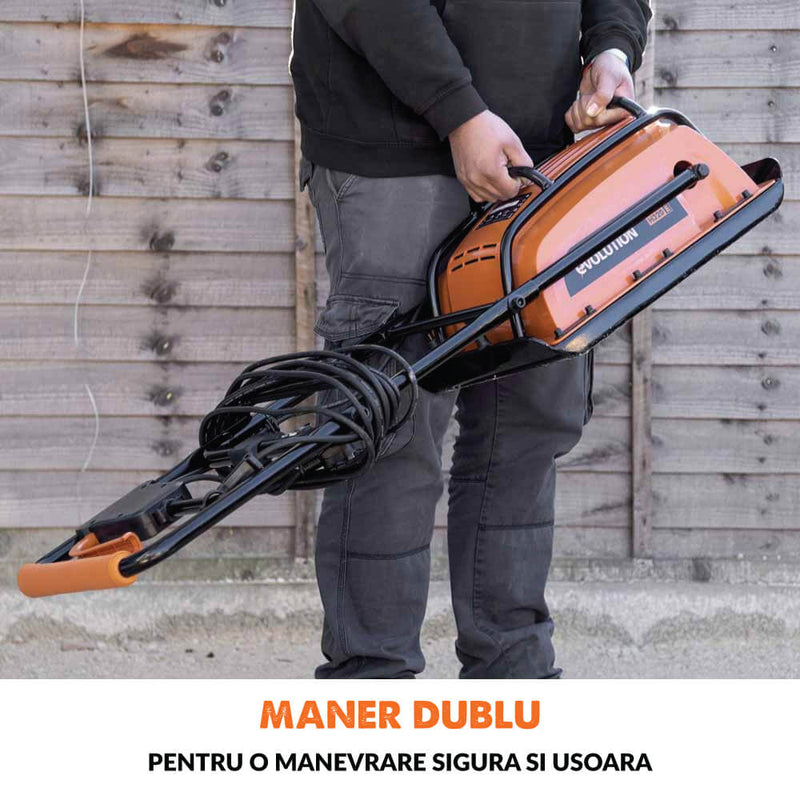 - Confortabil si sigur de utilizat, cu un control de declansare revizuit si maner gros, captusit. Motorul electric cu inductie nu produce fum nocivi (spre deosebire de compactoarele pe benzina).